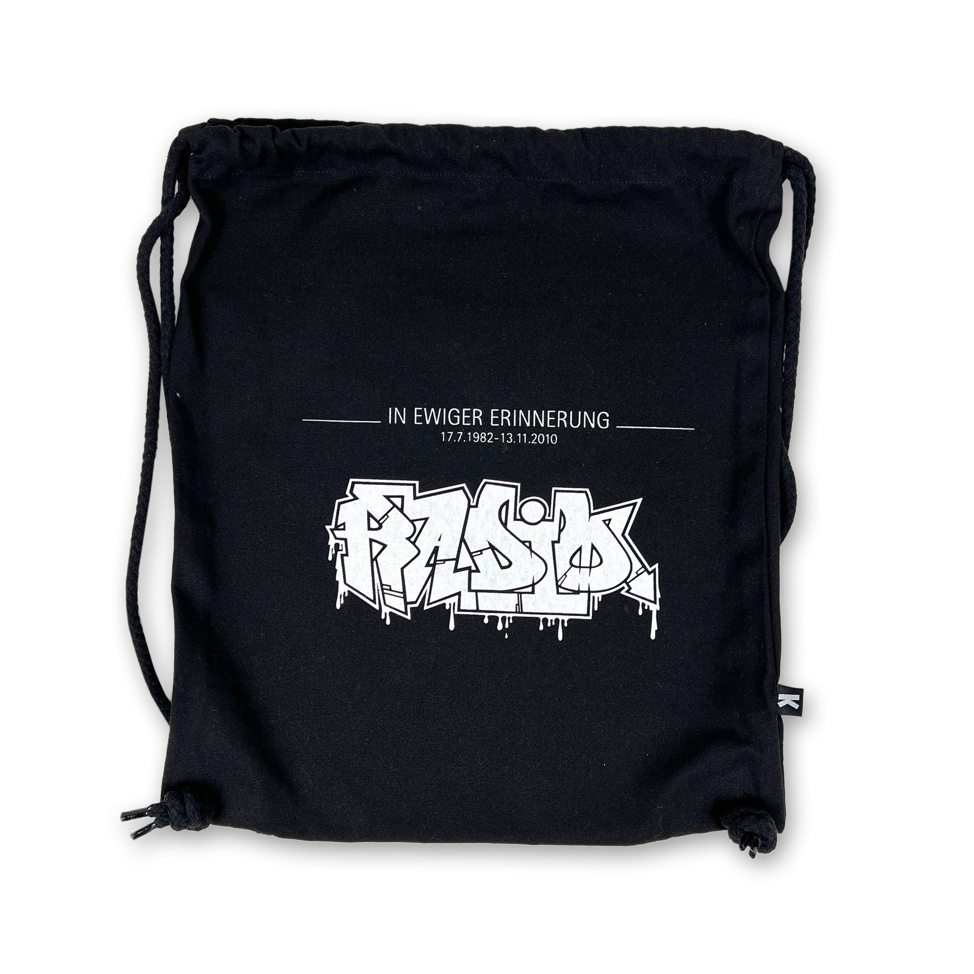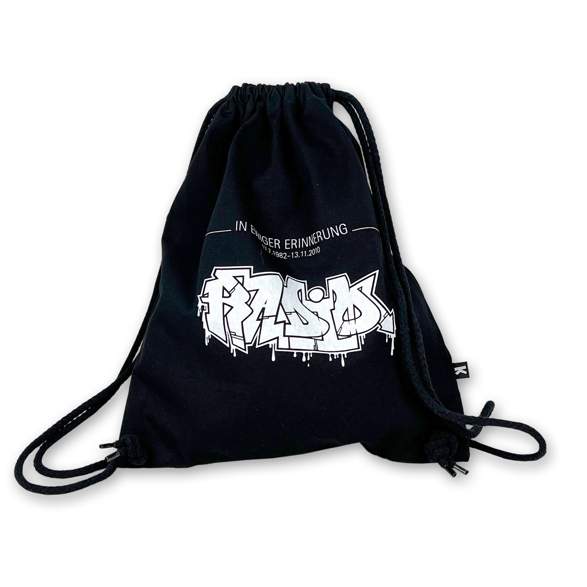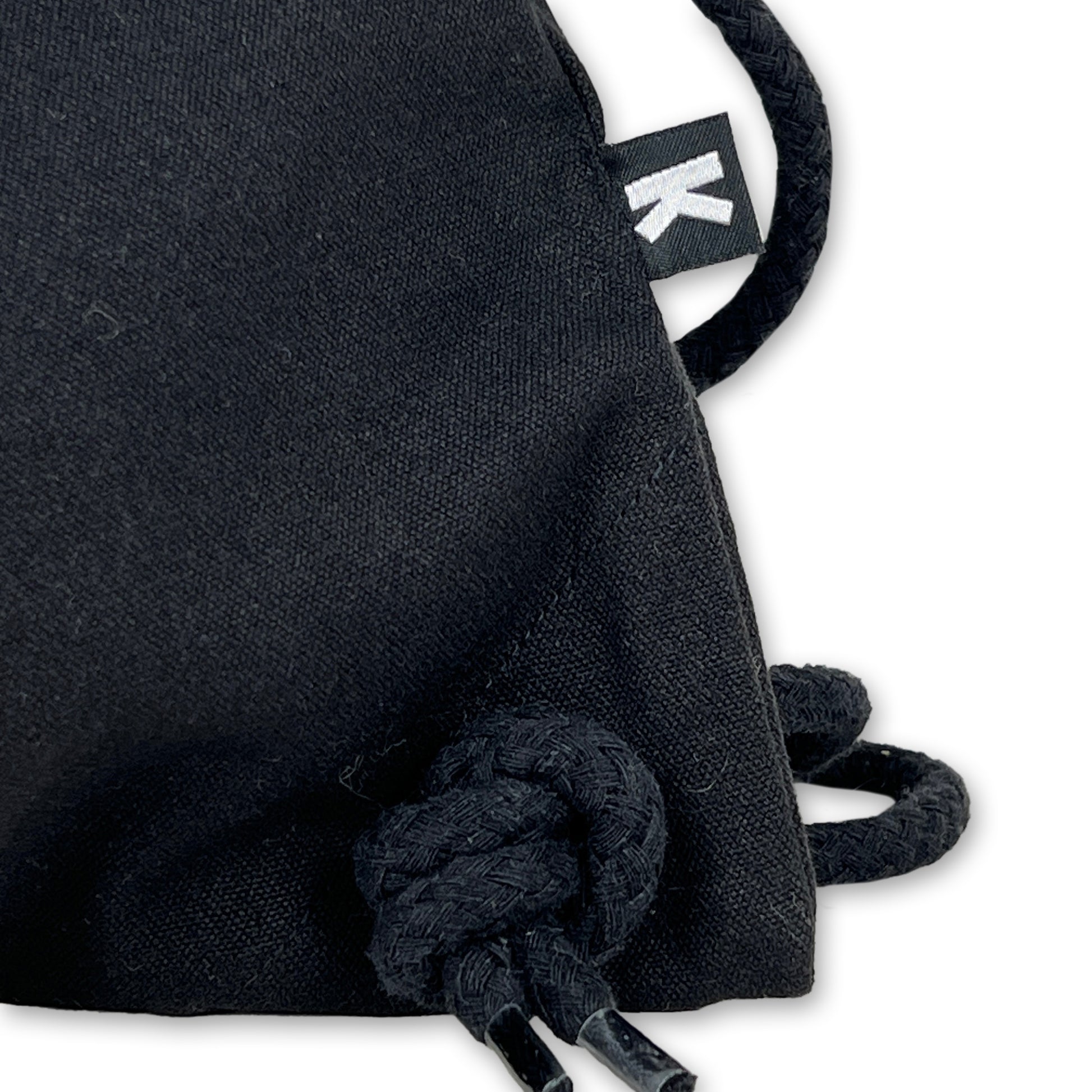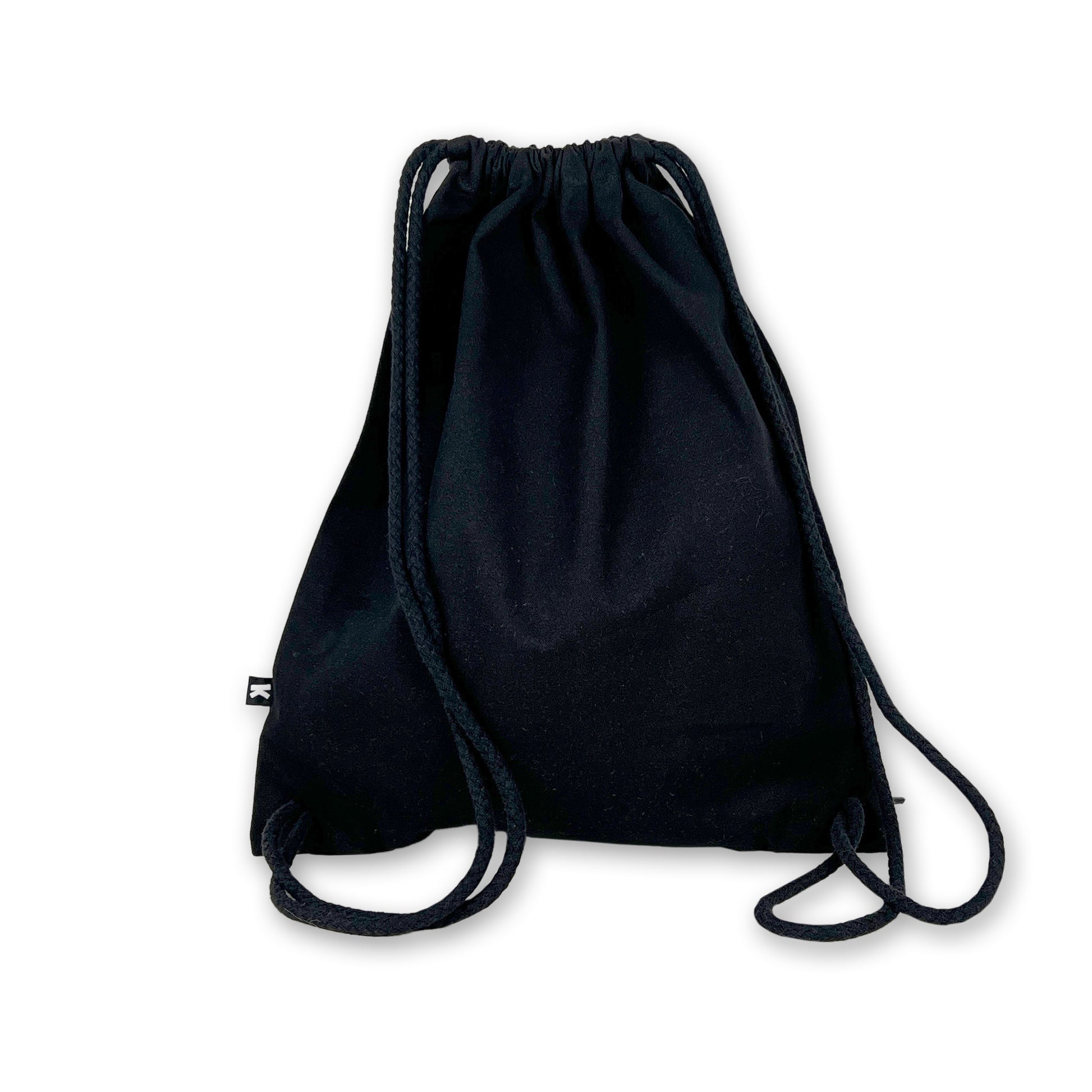 Black bag with 1-color screen print. Hand-printed.
